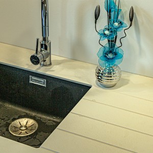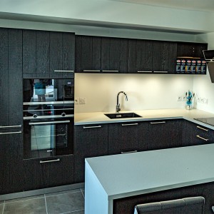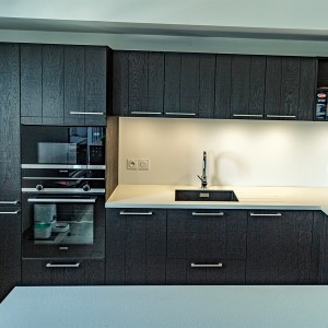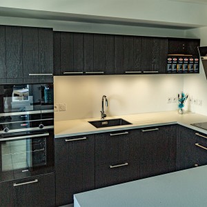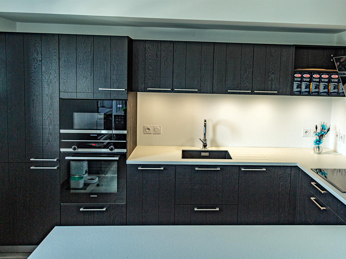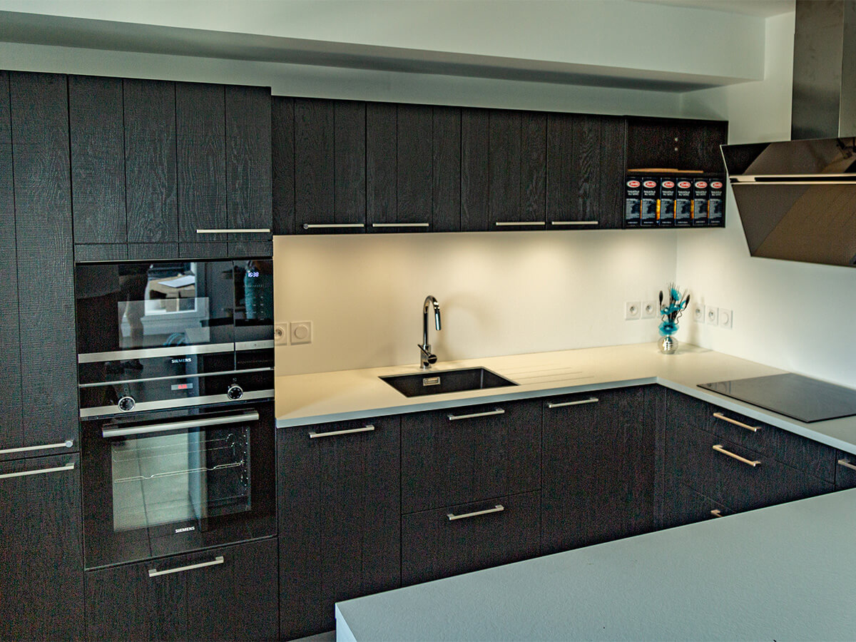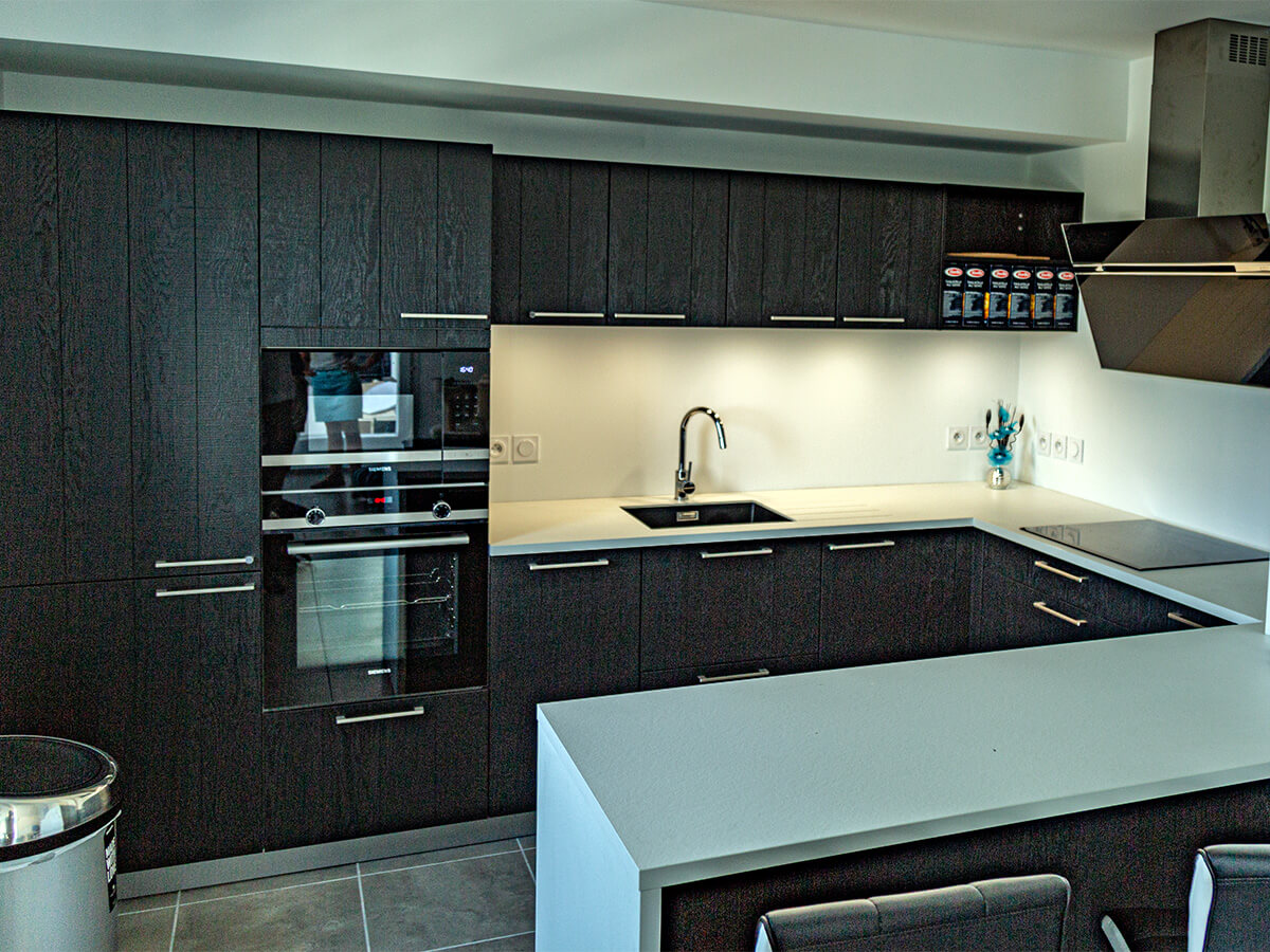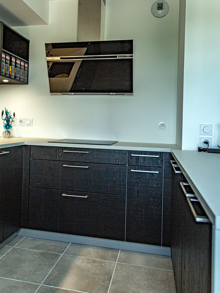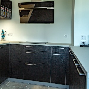 Sur la commune de Saint-Julien-en-Genevois, dans un appartement neuf, notre client est ravi de cette cuisine originale : une façade plaqué bois teinté noir avec un plan en compact, très résistant. Il a choisit une cuve sous plan et un égouttoir taillé directement dans le plan de travail. Il y a beaucoup de rangements très bien aménagés. Encore un client satisfait de nos services, nous sommes ravis.