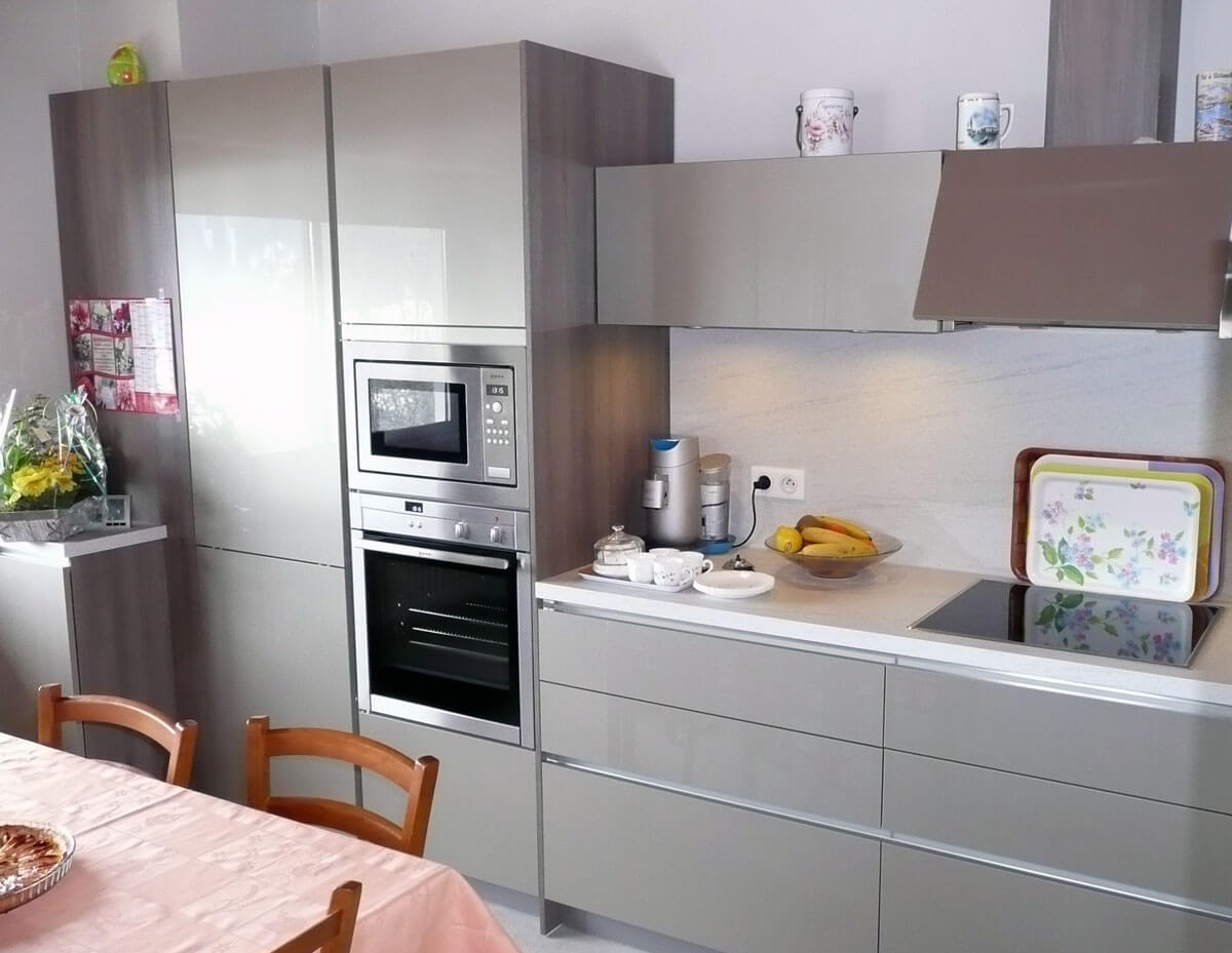 Pour ce projet, nos clients ont opté pour une façade couleur champagne, un plan de travail d’une couleur claire et le tout sans poignées ! Dans cette ancienne ferme savoyarde, la cuisine est d’une brillance exceptionnelle et très lumineuse.